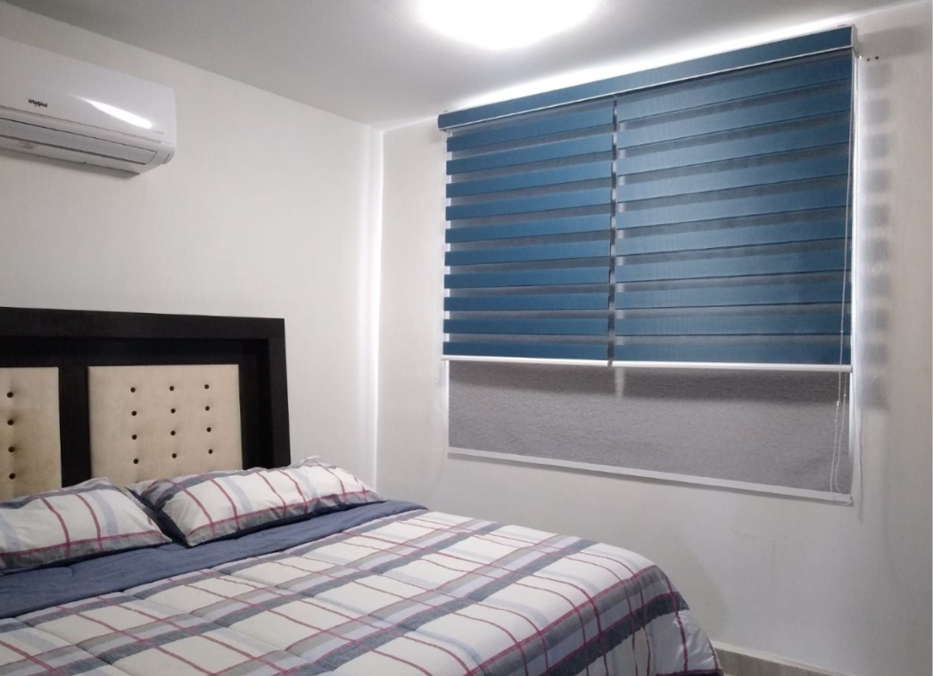La segunda, es ideal para ser utilizada durante la noche y es de tejido blackout.